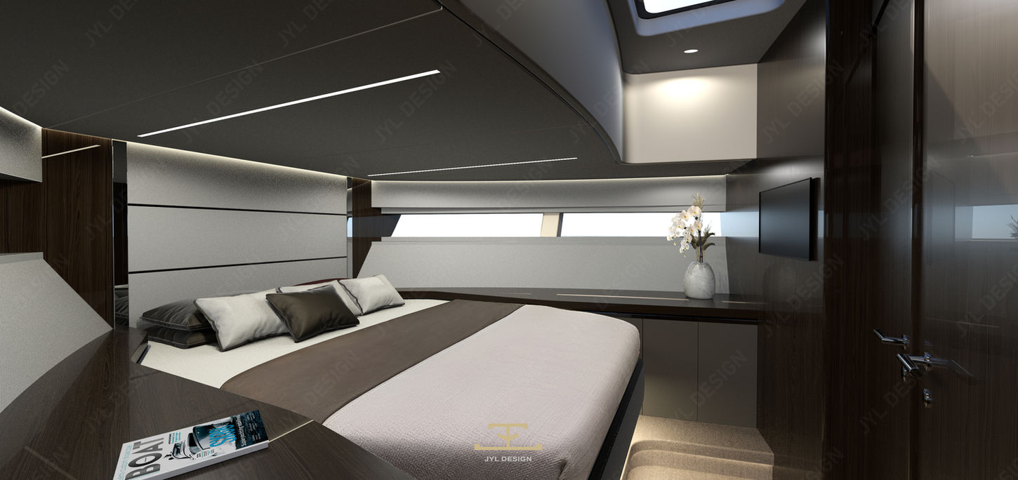 The Kingfisher is a sporty, luxurious and timeless yacht design concept inspired by the elegance of the kingfisher bird and the sleek aesthetics of the automotive world. Its distinctive hull features dynamic lines that mimics the kingfisher’s long, pointed beak symbolizing precision, speed and grace. A muscular volume that mimics the form of a tricep, giving the yacht a bold, masculine presence while maintaining fluid lines.This sculpted volume seamlessly integrates into the hull. Hydraulic foldable platform on both sides extends the usable space, enhancing comfort and accessibility. The roof, inspired by the hood of a Ferrari sports car, horn-like volume on both sides of the roof an artistic interpretation of the kingfisher bird’s iconic white stripes. These elements not only enhance the yacht’s visual identity but also give it a striking and recognizable character.